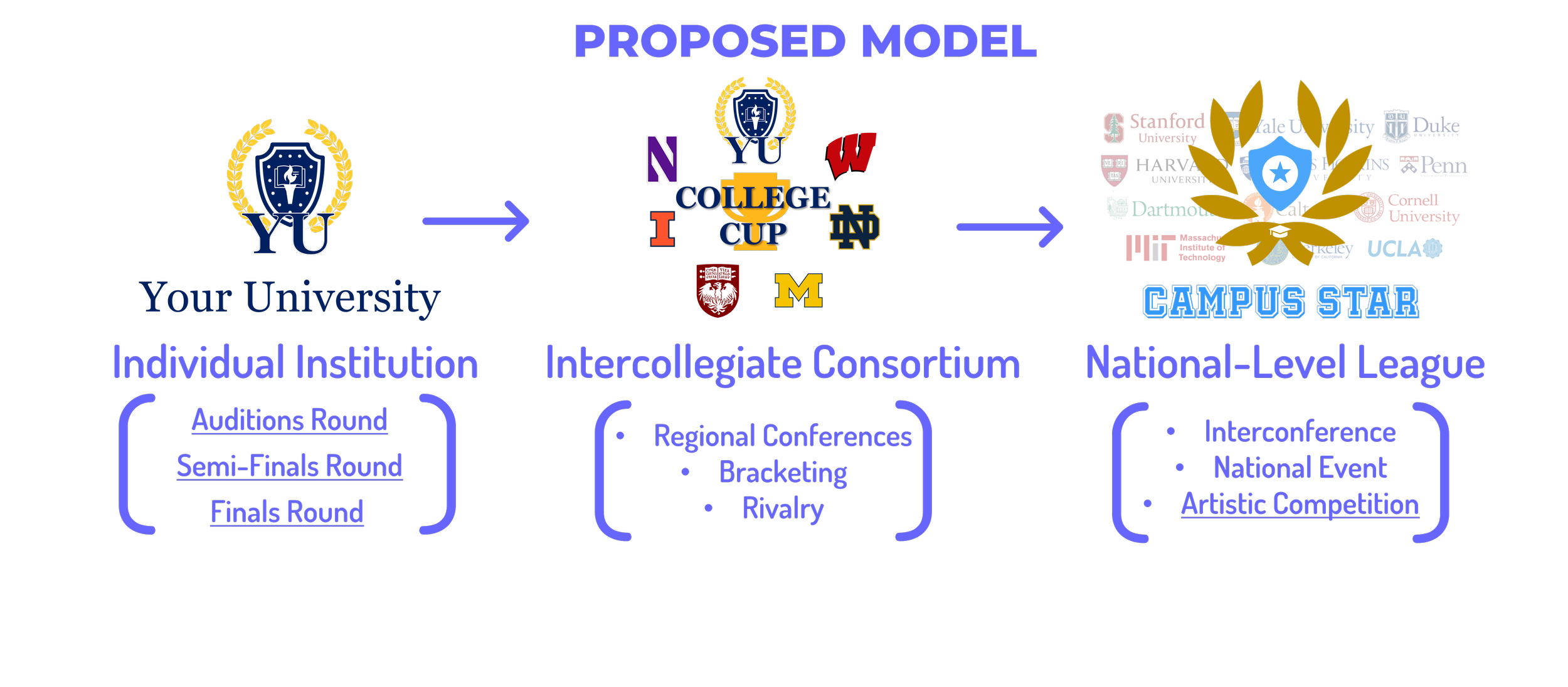 One could argue that if they could do this, they would have. The issue is generally that colleges and universities don’t typically attract this level of entertainment value primarily because it isn’t deemed profitable for the high-profile artist or, conversely, considered core to the institution’s educational mission. Alternatively, some institutions do manage to attract high-profile talent, but their skill set does not include talent development or allow for a lower barrier for entry. In many ways, one could compare the reasons why a university or college doesn’t have a perennially successful athletics program to why they may not have a lauded arts development program, let alone participating in an intercollegiate competition. There are many more points and reasons to discuss, but these are some of the primary factors.